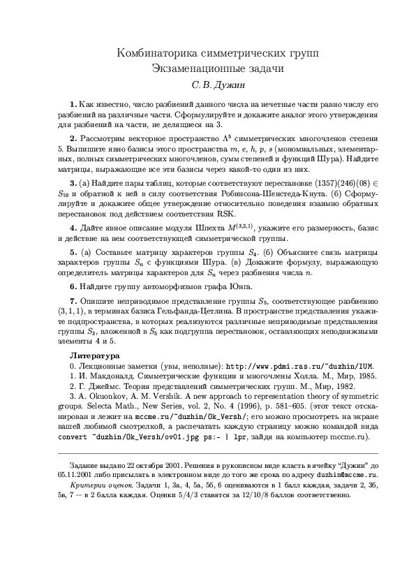 At last! -- the exam problems are ready and waiting for solvers!! Here they are: as JPG for viewing, PostScript for printing, and TeX source for running through TeX. Also available is the PostScript file of Okounkov--Vershik's paper (1996) which is on the list of literature. Another copy of the same can be found in my home directory on mccme.ru.